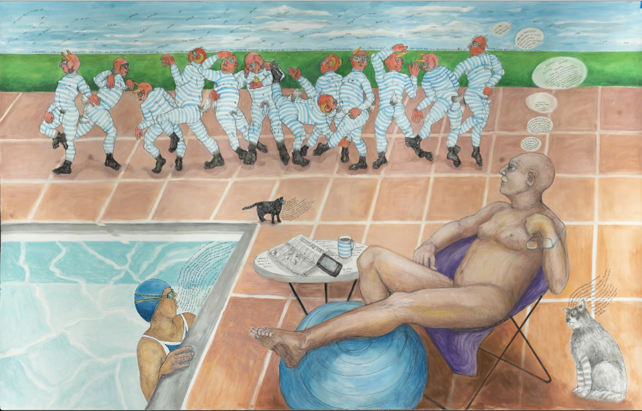 When I left Los Angeles in 1974, the Talking Heads’ You May Find Yourself song played on my car radio as I endlessly traveled Freeways. I worked as a graphic designer and set information into grids. It was Mid Century Modern, but we called it Danish Modern and Swiss Design. Life was comfortable but I felt stuck. I had to get out. Recently I revisited that time imagining a guy who “finds himself” Is this my beautiful house? Is this my beautiful wife? The tiles are the grid. There is a Hockney SoCal pool, dancing guys frolic while the couple do Sunday brunch inside their beautiful grid. After I finished this piece, I left it up for a couple months. It needed something. One afternoon I thought about David Byrne’s lyrics picked up a pen and wrote, first in the sky, then gave each character including the cats a chance to speak, basically like a cartoon.